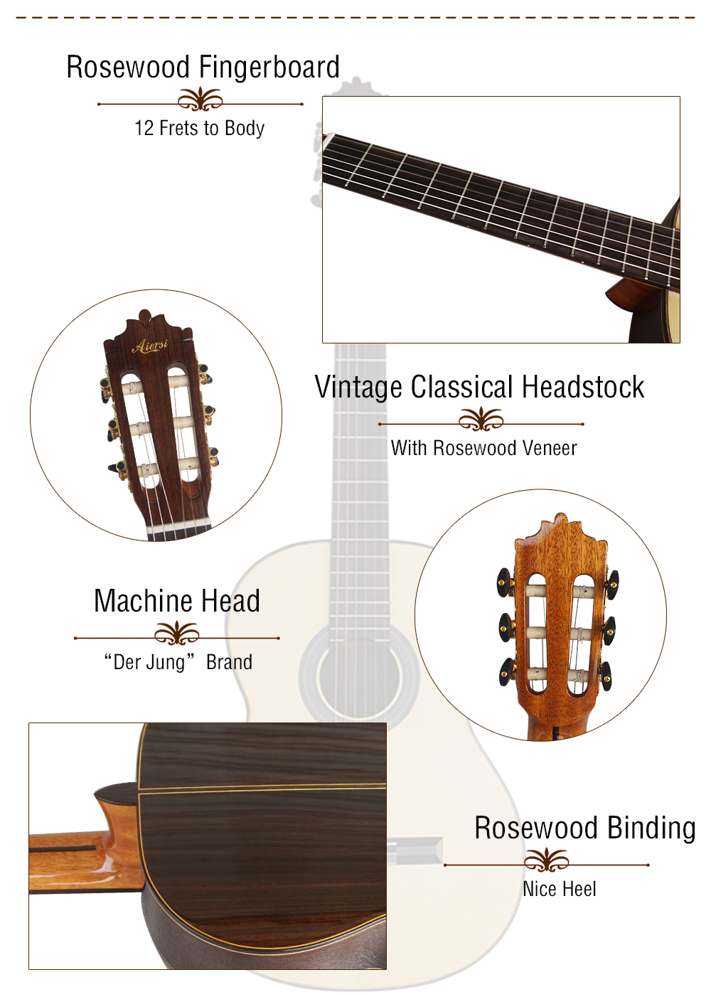 (unique & appealing appearance ) Features high glossy varnish with exquisite, delicate pattern around the vintage style sound hole.